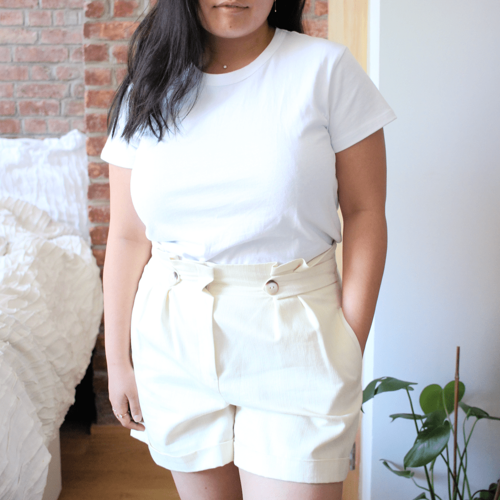 - Margo Tee from Leset | $58 (purchased online, full-price) | Own 1 | Added July 2020 | Length is perfect at 20″ for wearing tucked or untucked, which makes this the most versatile white tee I own. The fabric has a nice weight to it, which makes it drape nicely.