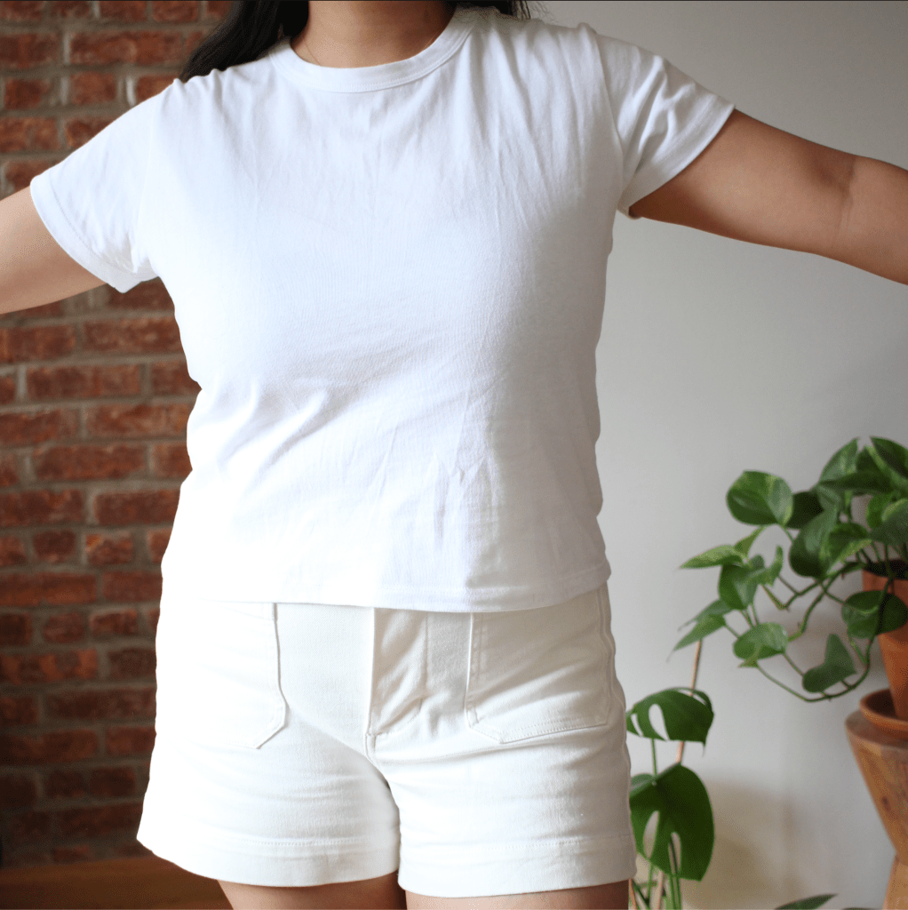 - Cropped length. My ideal tee-shirt length is about 20″. Figuring this out has helped me avoid buying tops that don’t meet this criteria. When I shop online, I’ll check for the dimensions before purchasing a tee (or any item really) and if they aren’t listed, I won’t buy it.